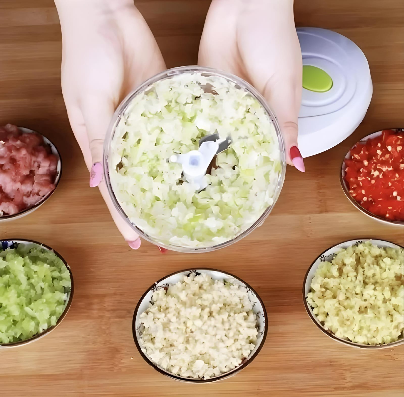 Com um simples puxar da cordinha, você tritura legumes, temperos, frutas e muito mais em segundos — sem esforço, sem barulho e sem sujeira.